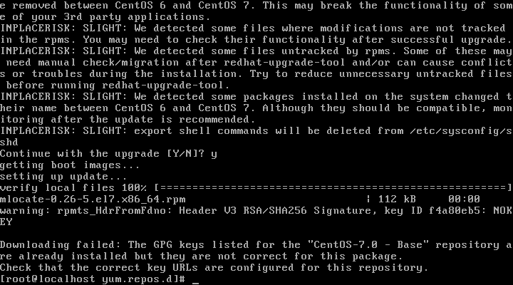 Hi, I tried testing the CentOS upgrade rpms and documentation, by trying to upgrade a (freshly installed) CentOS 6 virtual box image to CentOS 7. I tried following the steps described at http://wiki.centos.org/TipsAndTricks/CentOSUpgradeTool as closely as possible. There was just one minor hiccup. I had to disable gpgcheck after running, centos-upgrade-tool-cli because of the attached error. Apart from that, everything went smoothly, even though I had the EPEL repo enabled. Cheers, Gaurav Chaturvedi -------------- next part -------------- An HTML attachment was scrubbed... URL: <http://lists.centos.org/pipermail/centos-devel/attachments/20140823/faf99f07/attachment-0003.html> -------------- next part -------------- A non-text attachment was scrubbed... Name: Centos7_upgrade.png Type: image/png Size: 16390 bytes Desc: not available URL: <http://lists.centos.org/pipermail/centos-devel/attachments/20140823/faf99f07/attachment-0003.png>